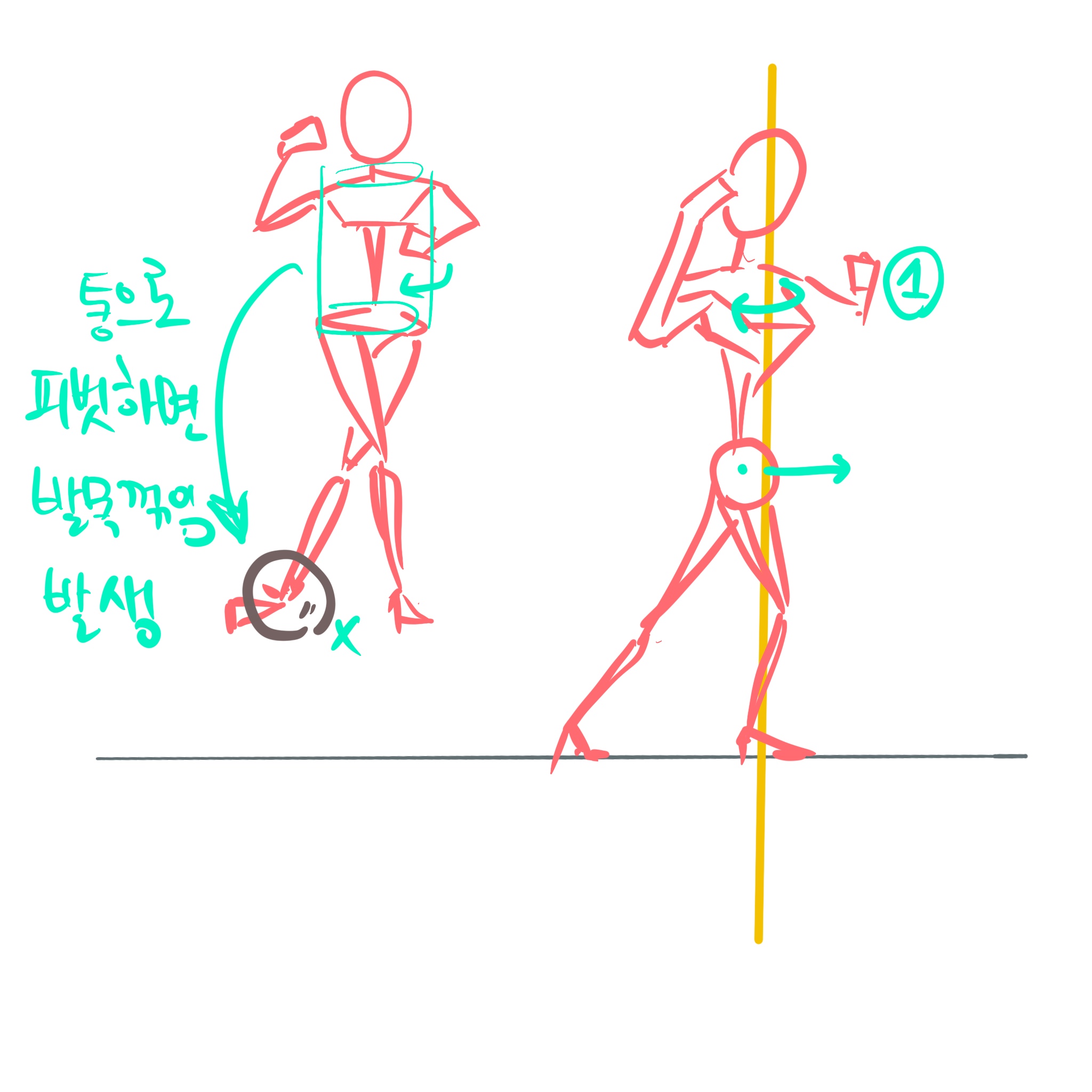 상체와 골반이 동시에 돌면 따라오던 발에 발목 꺾임 발생