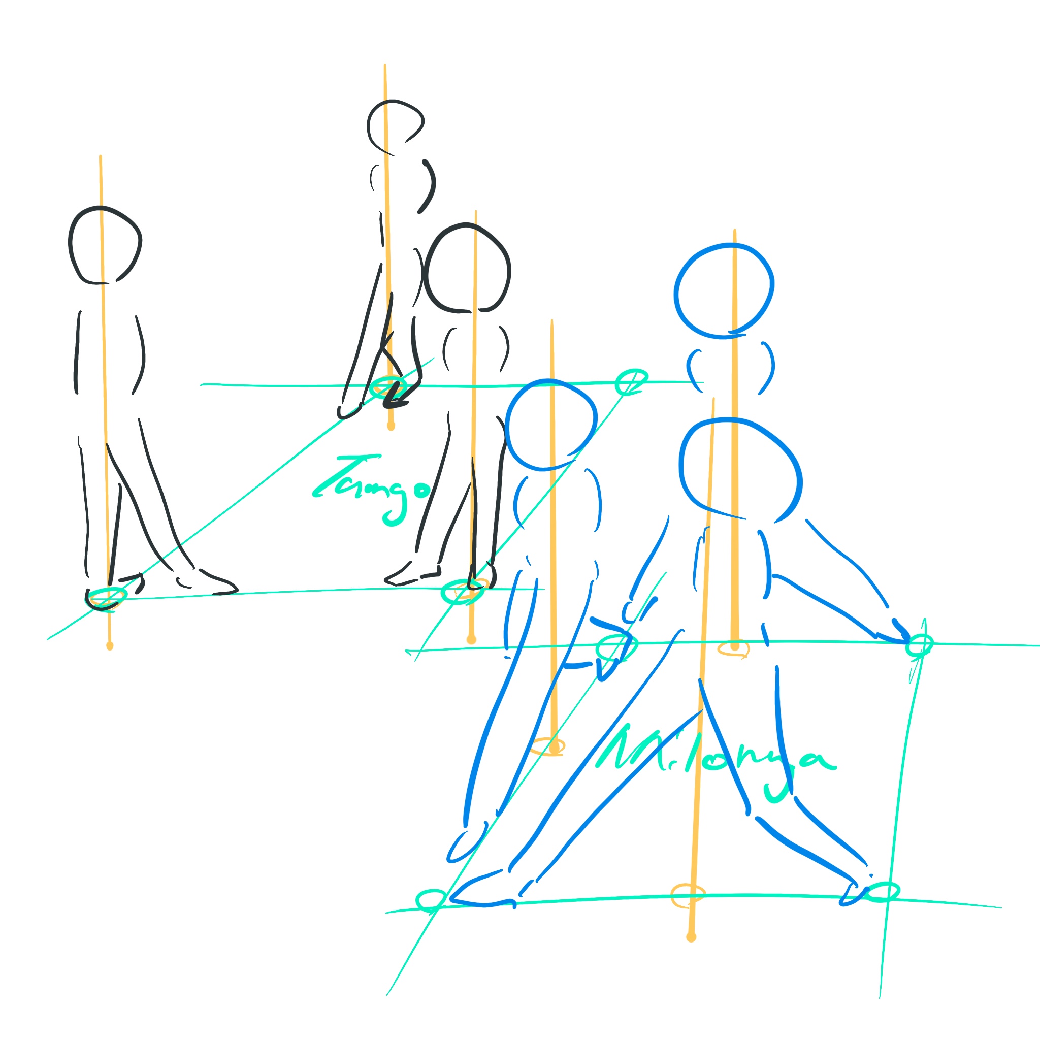 4각형을 그리며 걷는다고 할 때, 탱고는 각 꼭지점에 중심이 머물어요.