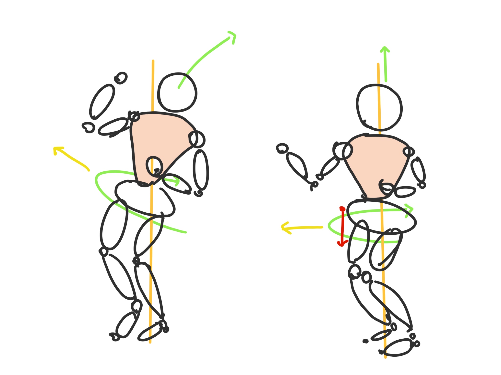 피벗은 하체가 돌아가기 때문에 상체도 함께 돌아가거나, 역으로 회전할 수 있지만