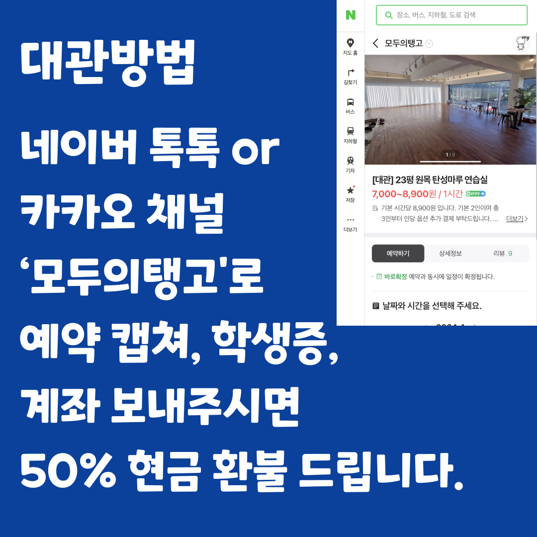 할인 방법은 대관 후 네이버톡톡 혹은 카카오채널 '모두의탱고'로 예약 캡쳐와 학생증, 계좌번호 주시면