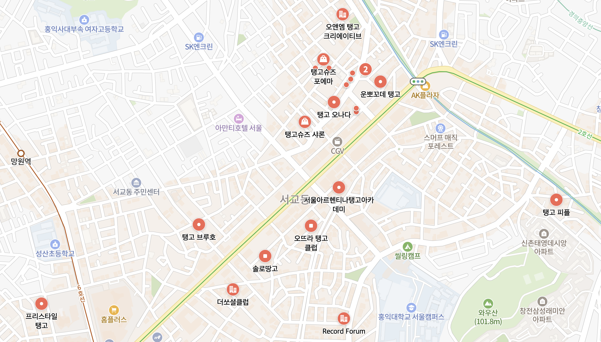 (위 지도 상에 보면 홍대에 20개 가까이 탱고 관련 장소가 있습니다)