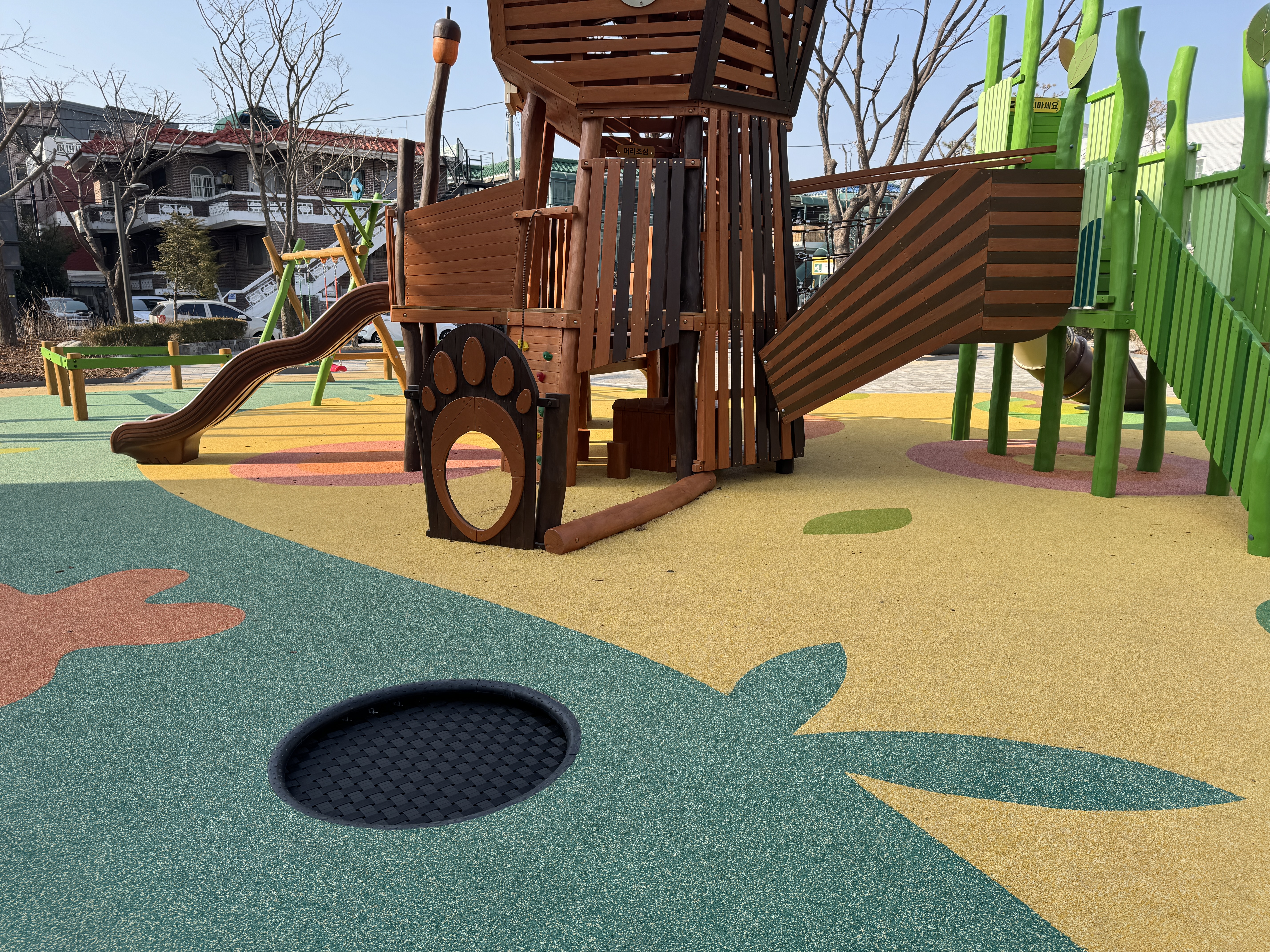 오늘 아침 산책길, 새로 단장한 놀이터에서 발길이 멈췄습니다.