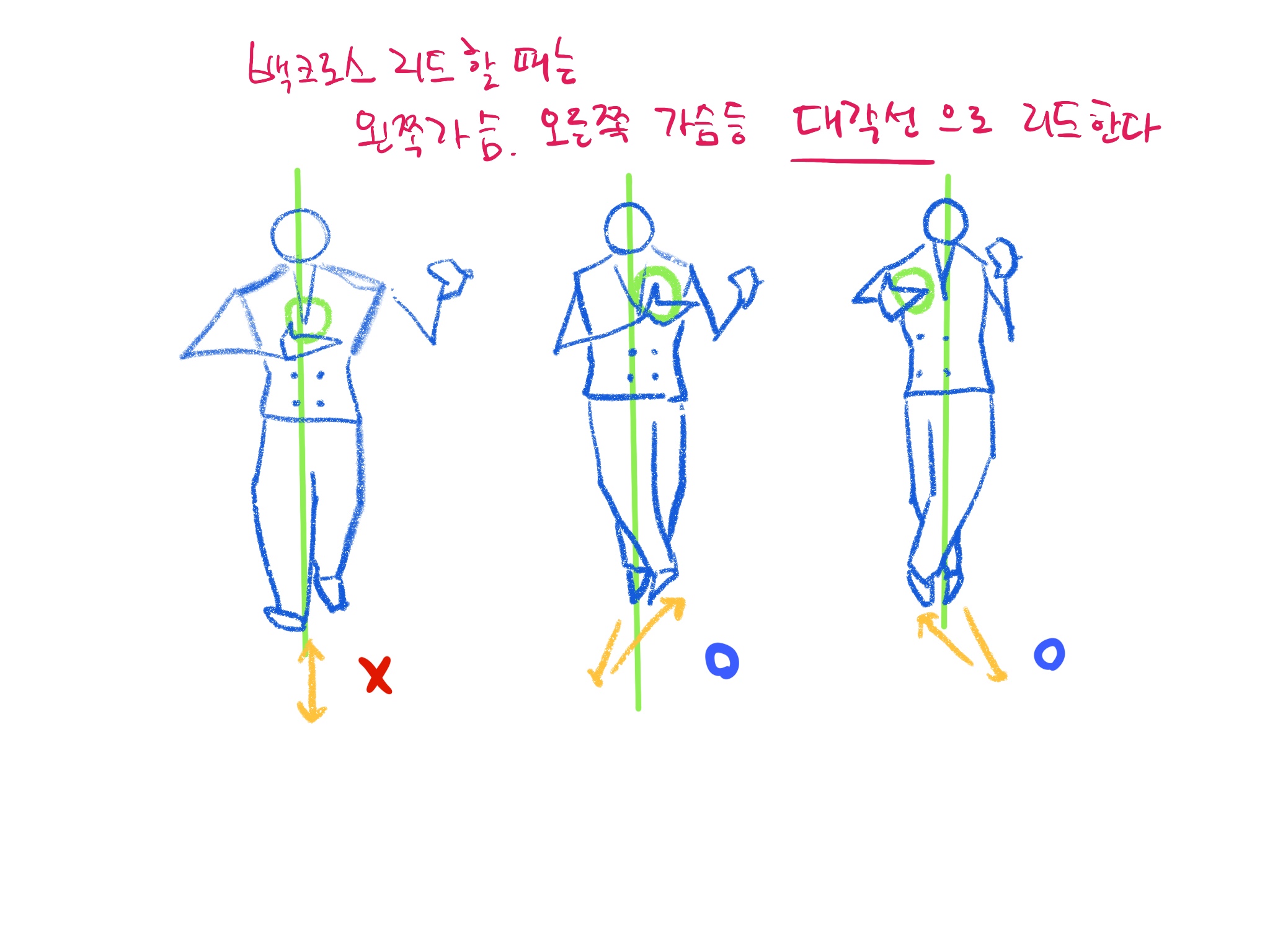 - 이따 앞과 마찬가지로 팔로워 등에 있는 자신의 손이 자신의 왼쪽 가슴방향으로 당기듯 사선으로 리드한다