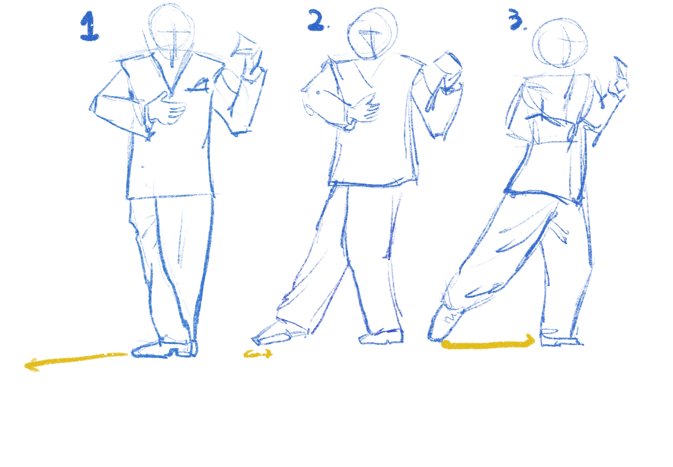 - 1박에 다리가 정면, 2박에 피벗과 다리는 거의 180도에 가까움, 3박에 왼쪽발이 오른쪽 발 뒤에 붙은 상태로 크로스 된다.