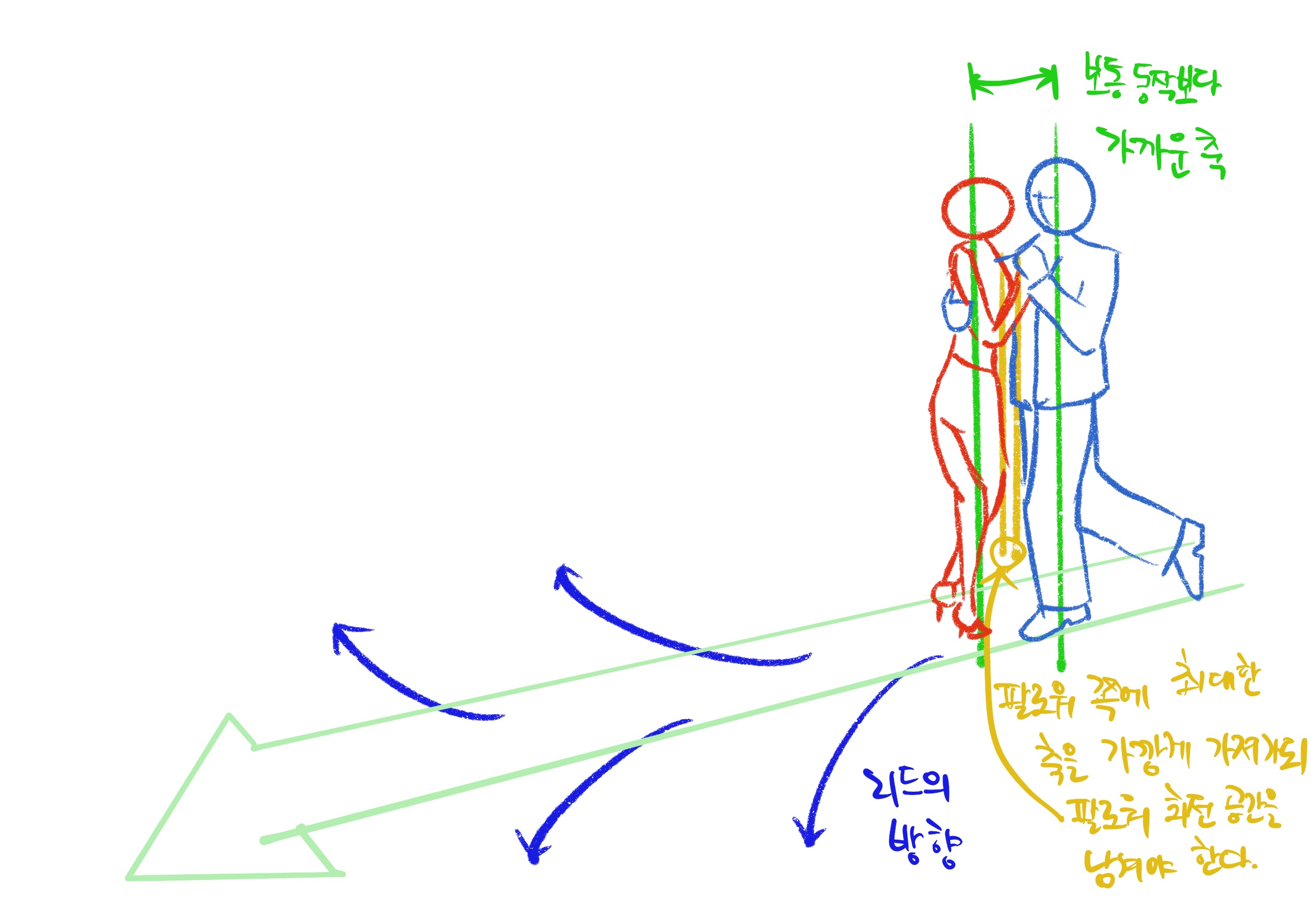 - 살짝 원을 그리며 대각선 밖으로 원을 그리며 나가는 듯 리드해야 한다.