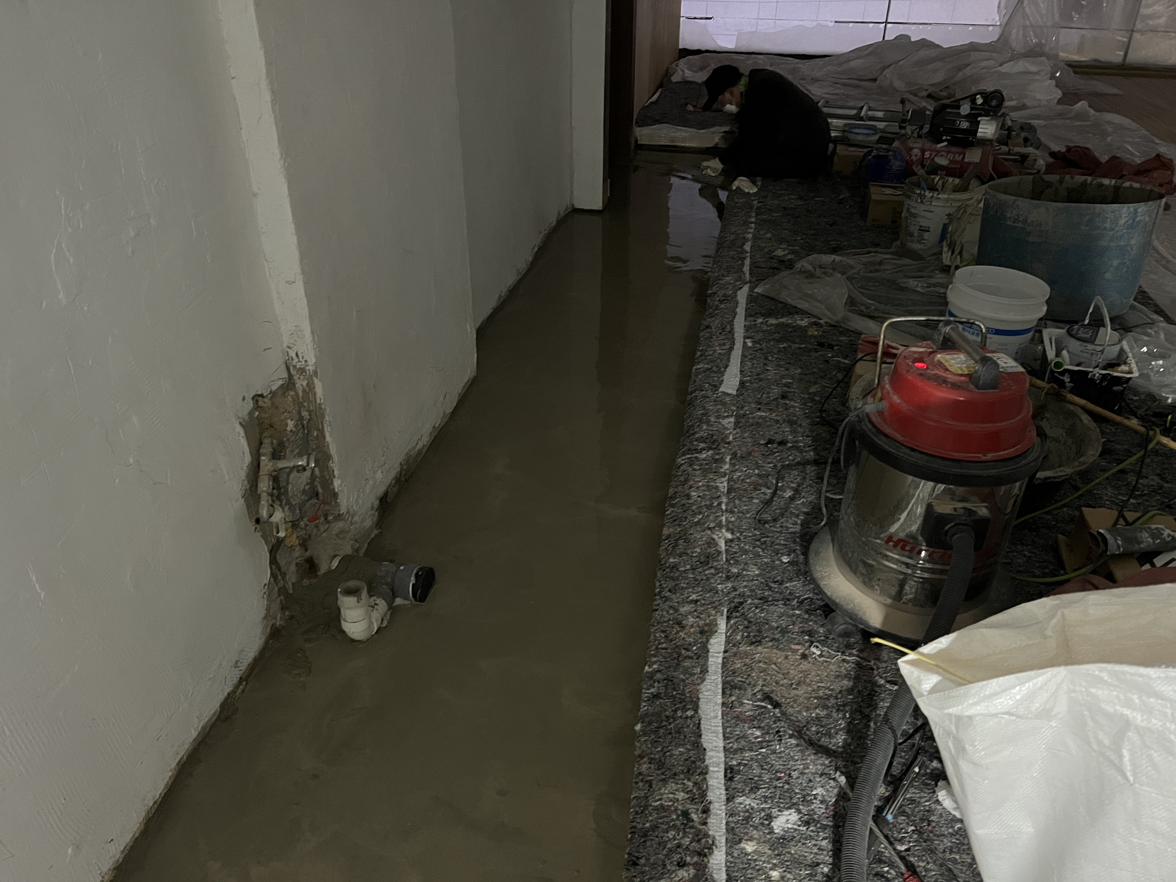 내일이나 모레 타일을 깔기 위해 바닥을 고르게 미장하고 있습니다.