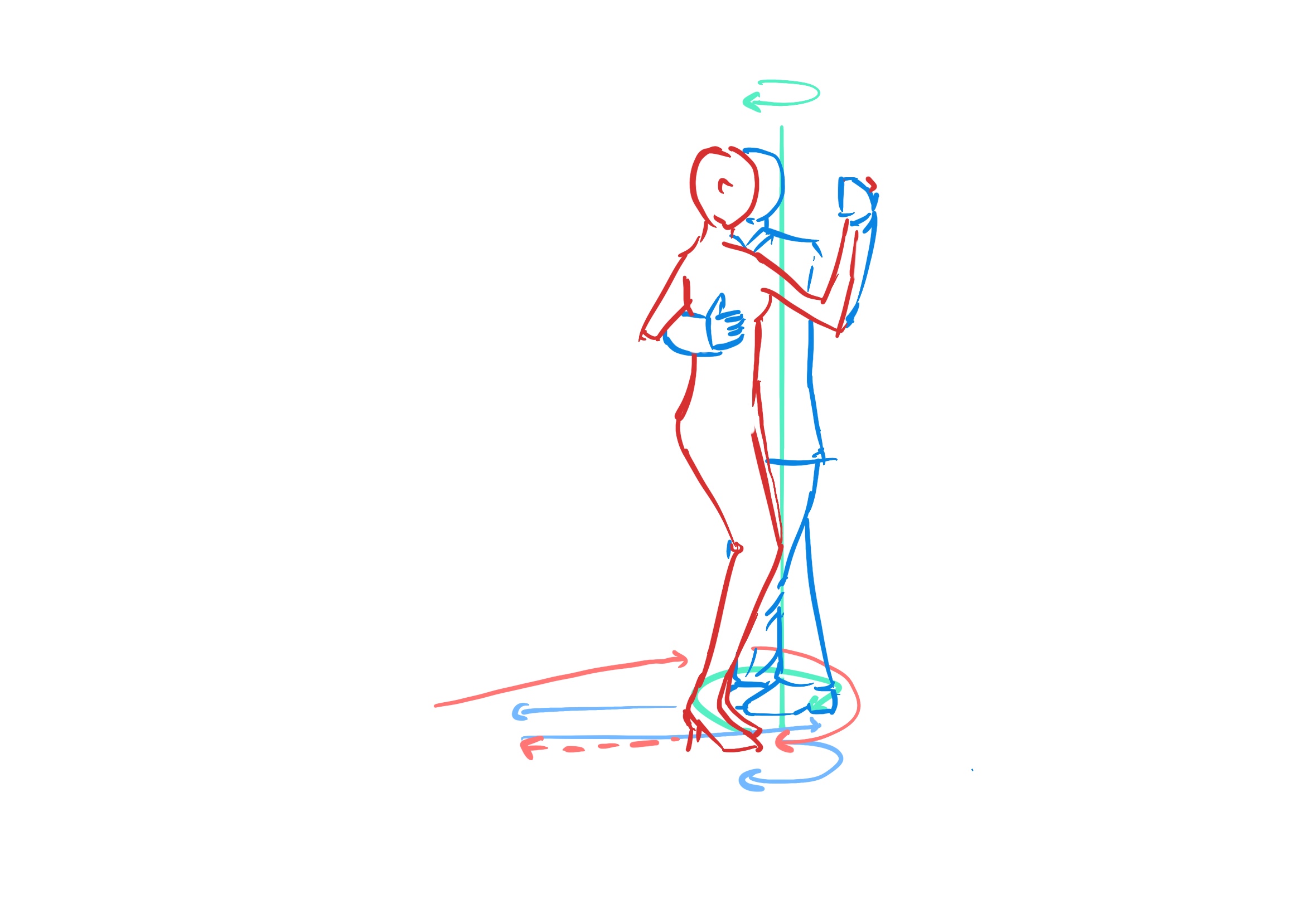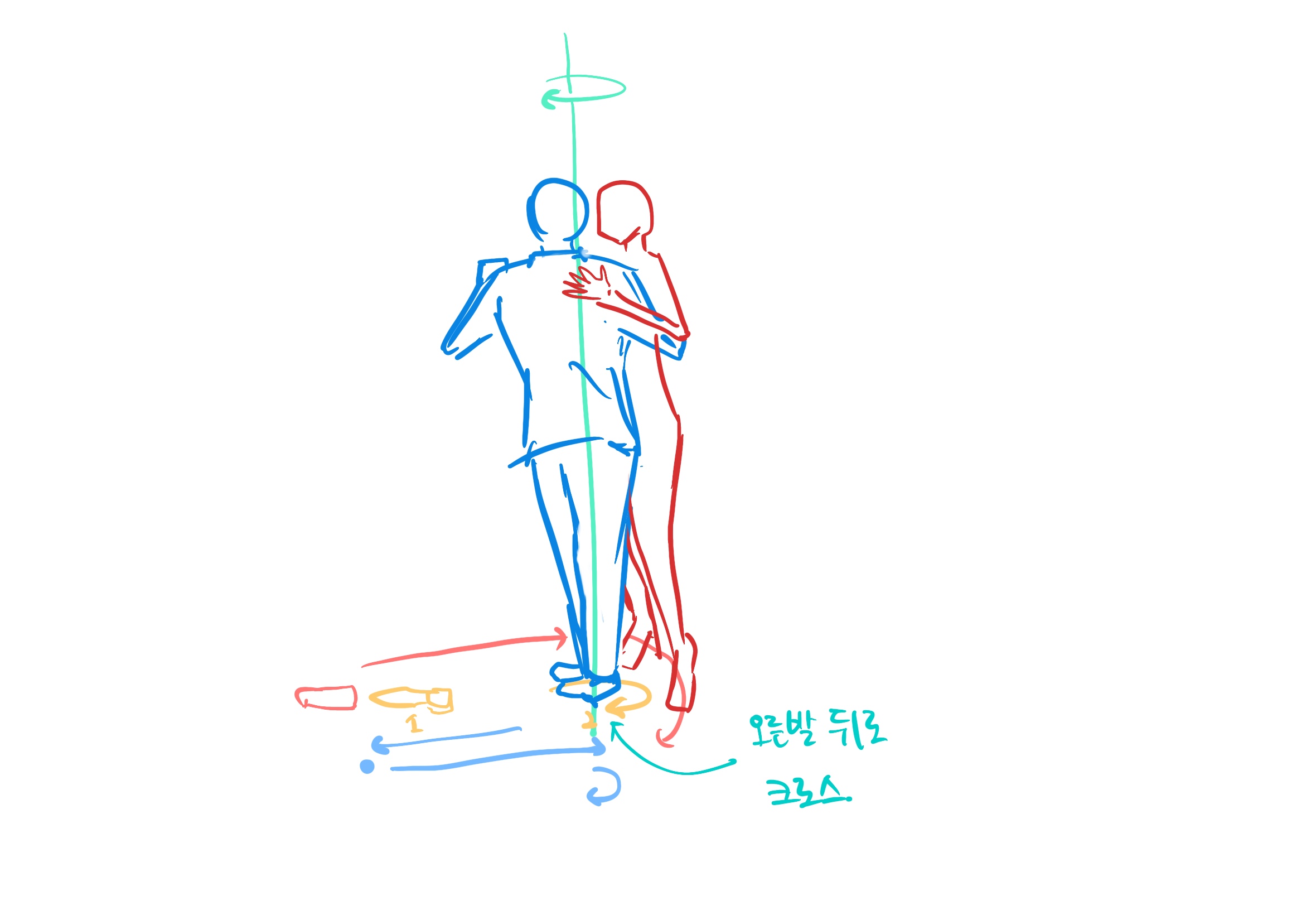 - 리더: 팔로워를 우측 뒤로 회전 리드를 하며 자신의 오른발을 뒤로 크로스