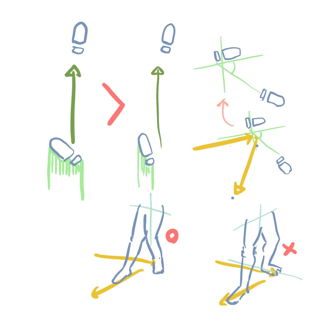 디딤발에 비펏을 주고, 다리를 최대한 정면으로 뻗을 수 있도록 골반을 진행 방향으로 변경 시킵니다.