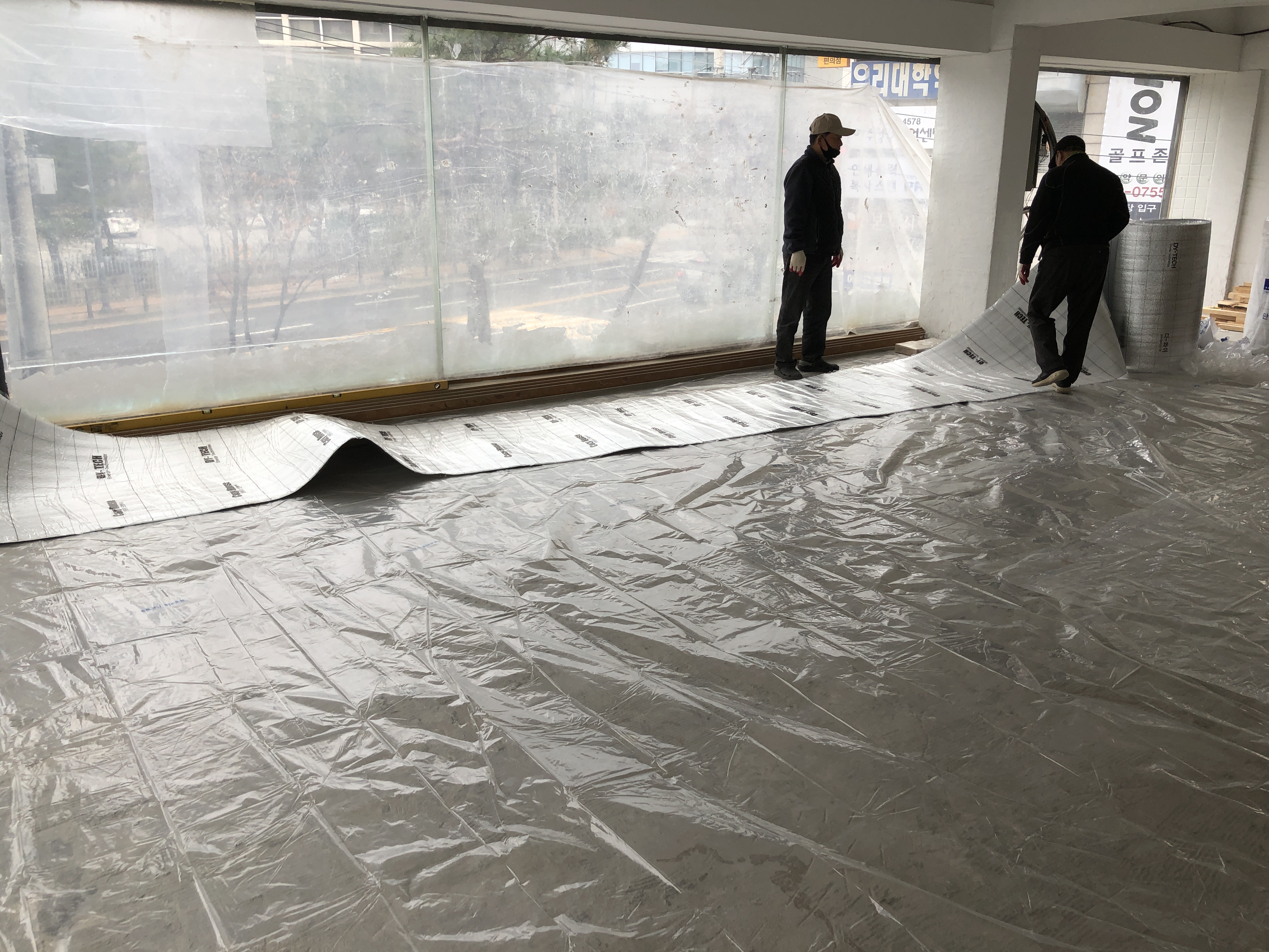 내일이나 모레 타일을 깔기 위해 바닥을 고르게 미장하고 있습니다.